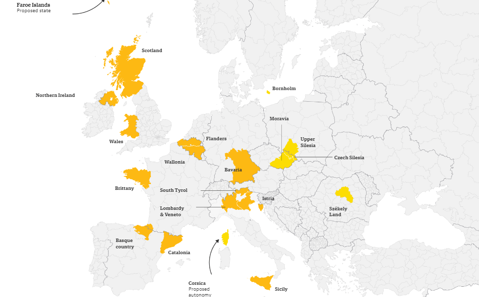 TheGuardian’da 2017 tarihinde yayınlanan Avrupa’daki bağımsızlık isteyen bölgeler haritası ve listesi. Nüfus verileri, 2017 tarihlidir.